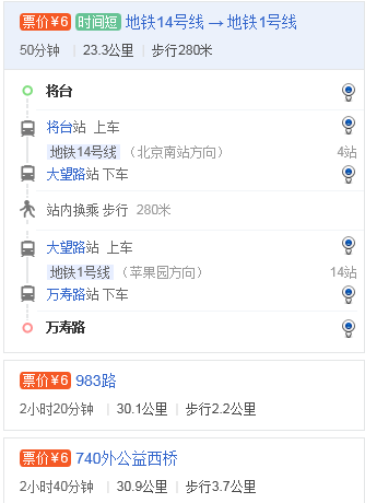 將臺路到海淀萬壽路23.3公里,坐地鐵14號線4站,到大望路站轉地鐵一號線14站到達。具體位置和線路如圖所示。